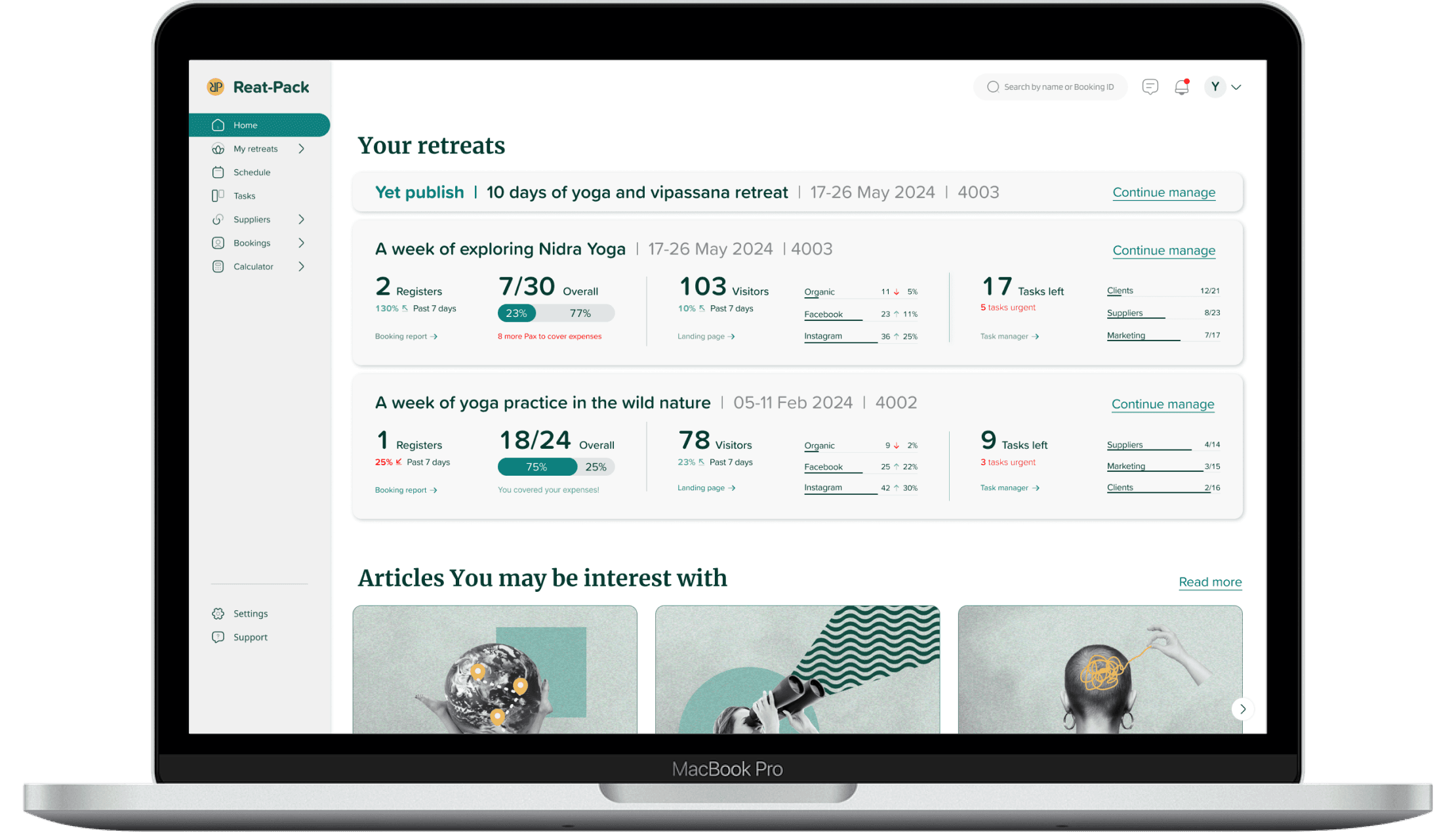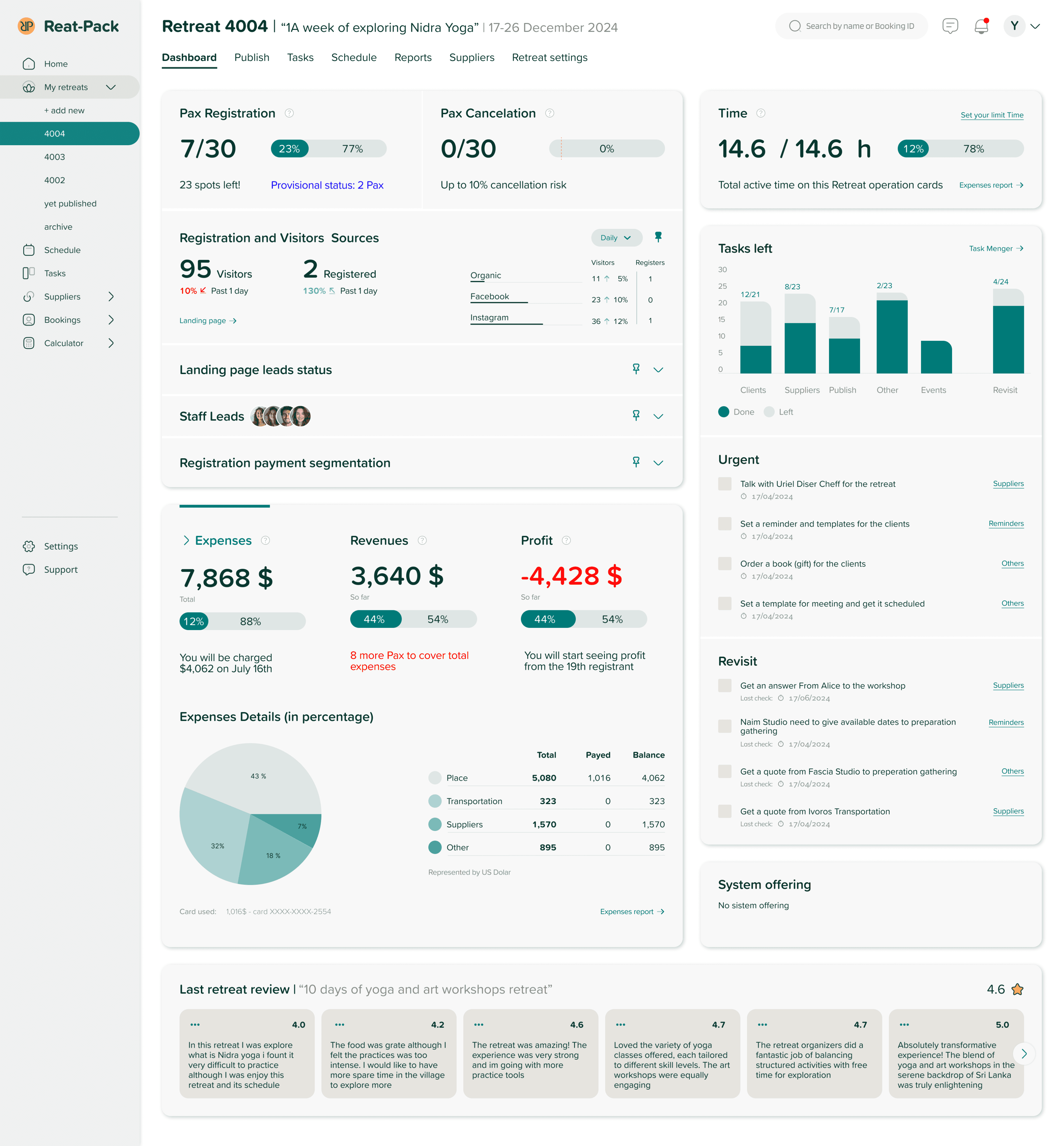 The dashboard of each retreat displays registration status, financial status, urgent tasks, and time managing the retreat.